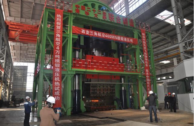 2012年3月3日,中國首臺40000噸級模鍛液壓機,在西安閻良三角航空科技有限責任公司進行熱試車,并順利鍛造出了大型盤類件產(chǎn)品。該機采用鋼絲纏繞預應力結構。